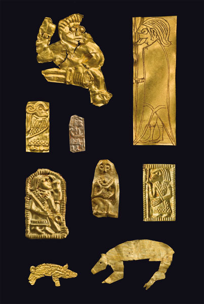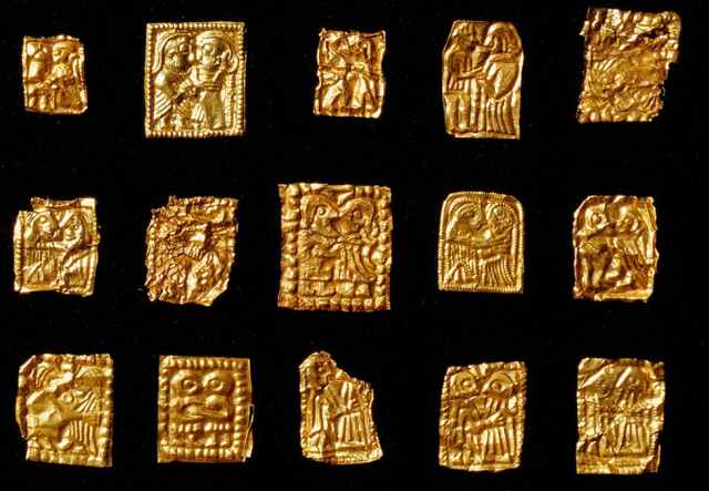 These are gullgubber found at Sorte Muld, Bornholm, Denmark.