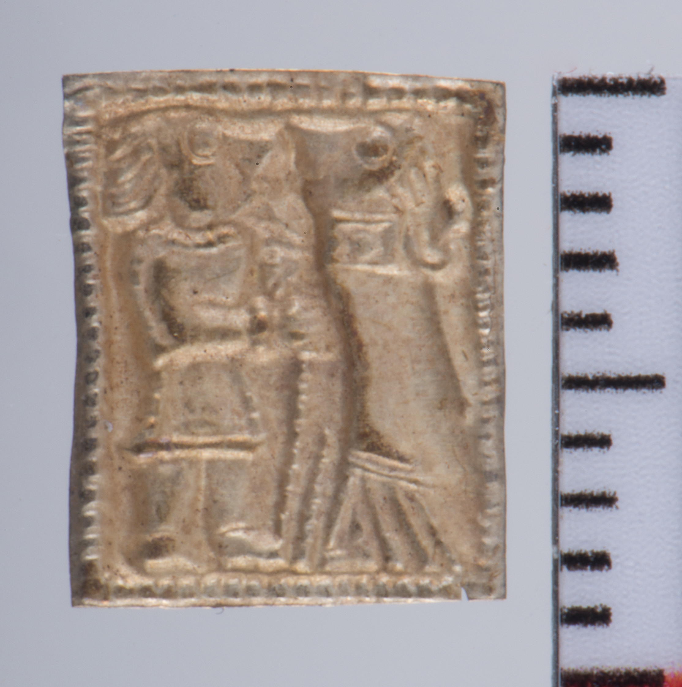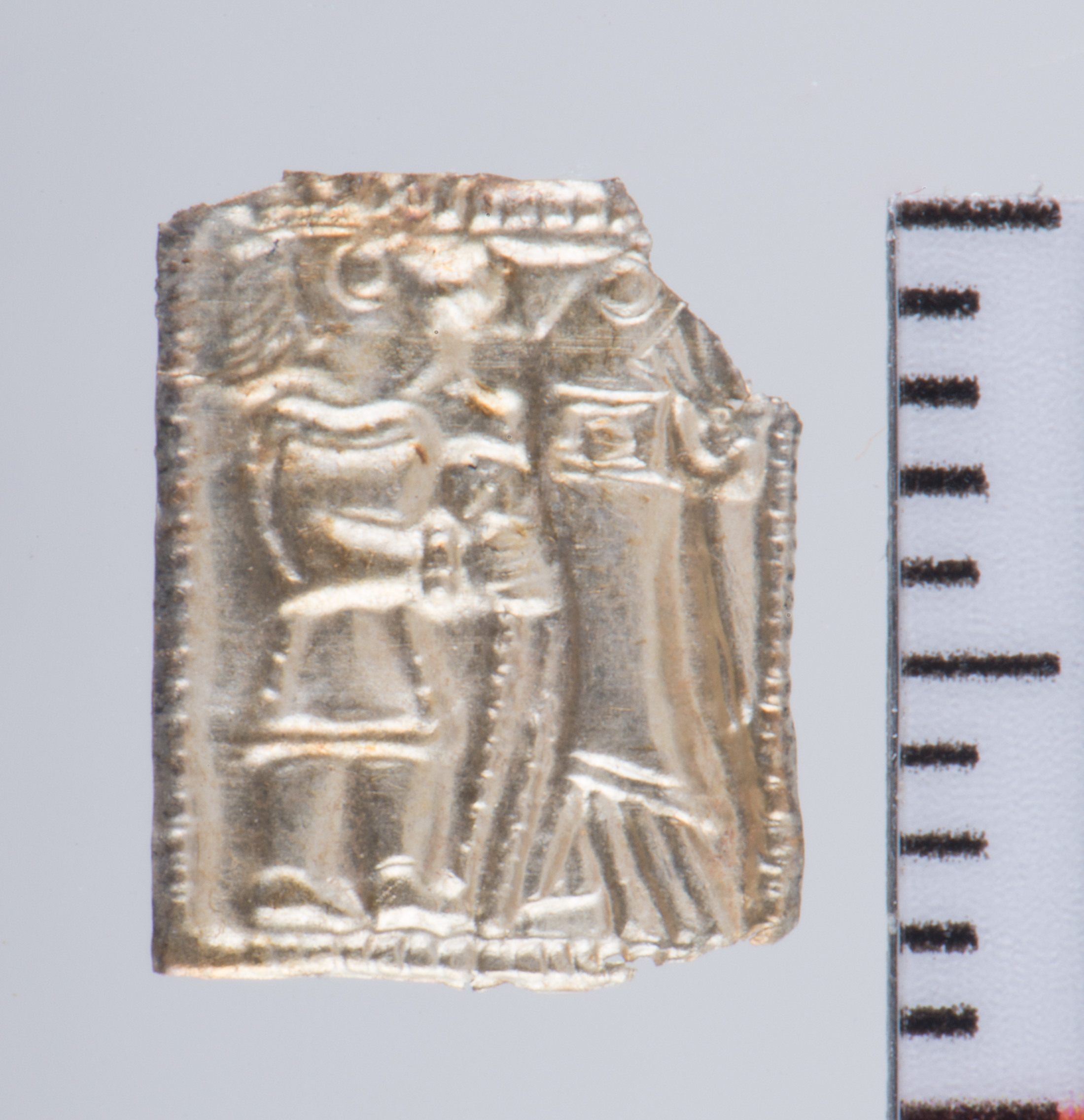 Gullgubbe T18842:5 found at Mære, Norway. It is almost complete, but with some damage in the upper right corner. This one is also a rectangular plate with two opposite figures in profile. The person on the left has short hair and seems to be holding a sword or a staff in front of him. The person on the right has longer, straight hair and is dressed in a long dress with a shorter overcoat or robe, and a cloak. Both of the have two round shapes on the chest that might be oval brooches for the female figure and perhaps some other type of brooches for the male figure. The plate has a beaded frame around the edge.