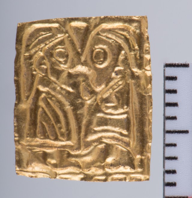 Gullgubber are small and thin plates of gold with figures on them, they are usually between 1 and 2 cm2 in size. The pieces of gold would either be cut to the desired shape or stamped with a patrician. Such stamps for the production of gullgubber have been found in a few places in Sweden and Denmark, but none in Norway. They are the oldest examples of toreutics in Northern Europe. The word gullgubbe means “man of gold” and is taken from a report published in 1791 by Nils Henrik Sjöborg. In the report he said that villagers in Ravlunda who found them in the dunes, called them guldgubbar. Gullgubber have only been found in Scandinavia and they occur in the Merovingian period (570-800 AD), with some continuity into the early Viking age.