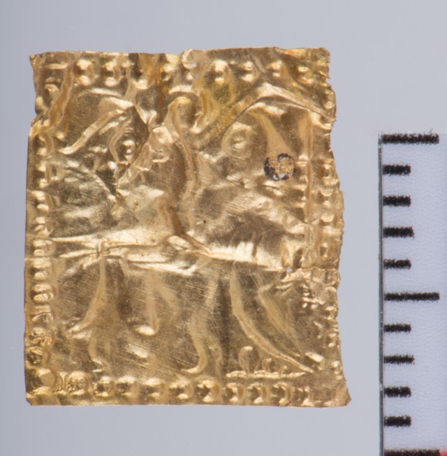 There are four gullgubber from Mære that seems to have been made from the same stamp, according to the information about them on Collections Online, NTNU. Three of them (shown below) is as good as complete, and one is too damaged to see the motif. You can compare them yourselves: